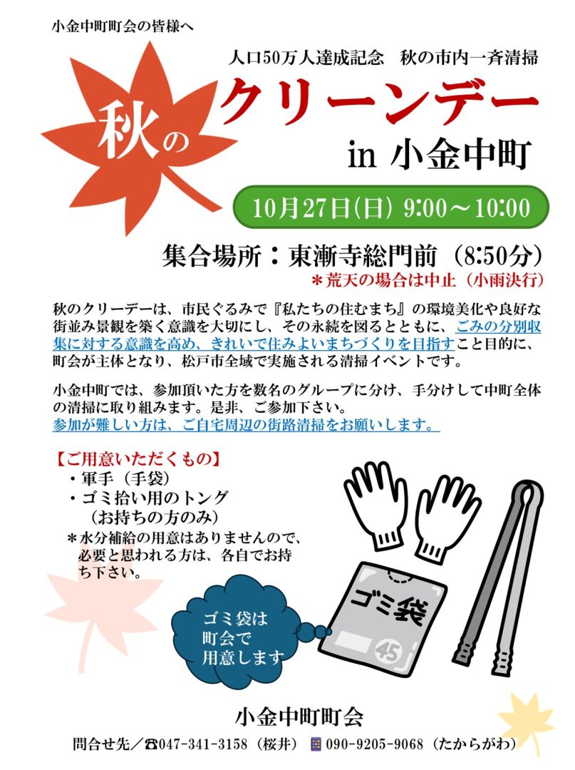 秋のクリーデーは、市民ぐるみで『私たちの住むまち』の環境美化や良好な街並み景観を築く意識を大切にし、その永続を図るとともに、ごみの分別収集に対する意識を高め、きれいで住みよいまちづくりを目指すこと目的に、町会が主体となり、松戸市全域で実施される清掃イベントです。