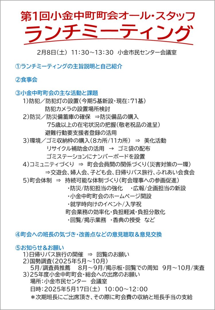 第一回「小金中町町会オールスタッフ・ランチミーティング」を2/8日(土)小金市民センター会議室で行いました。
