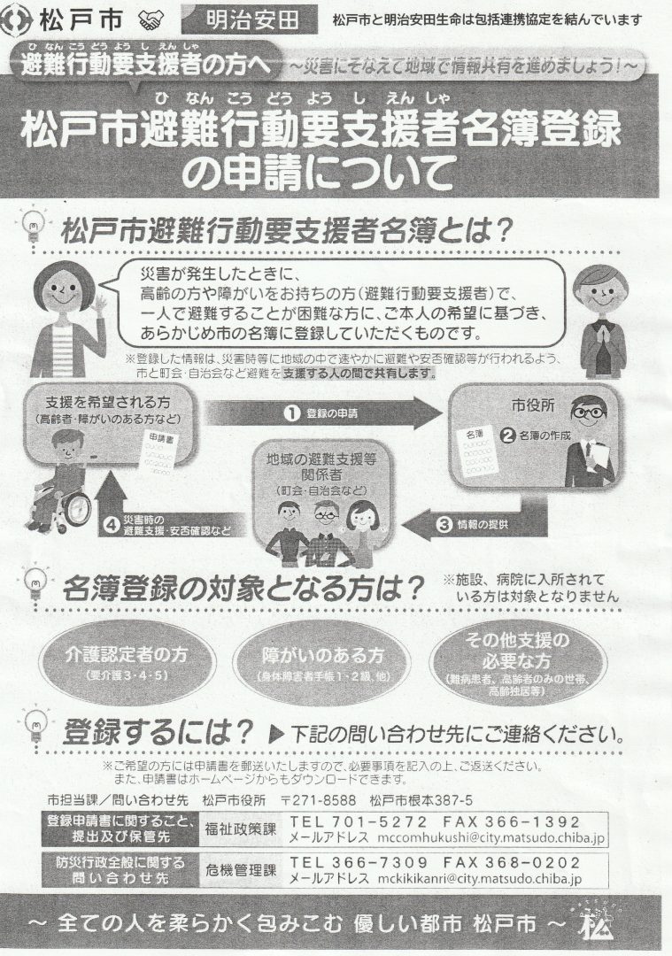 「松戸市避難行動要支援者名簿登録の申請について」のチラシを全戸配布します