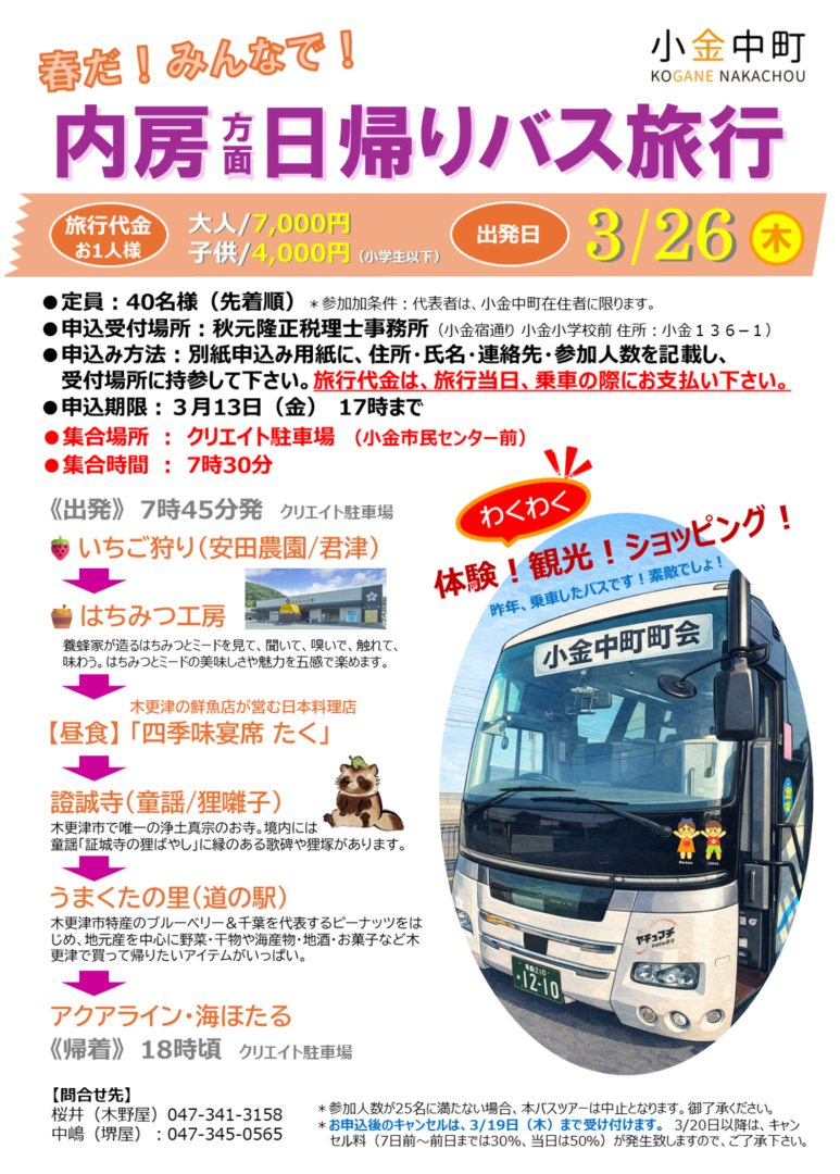 2026年小金中町町会主催のバス旅行の参加者募集を開始しました