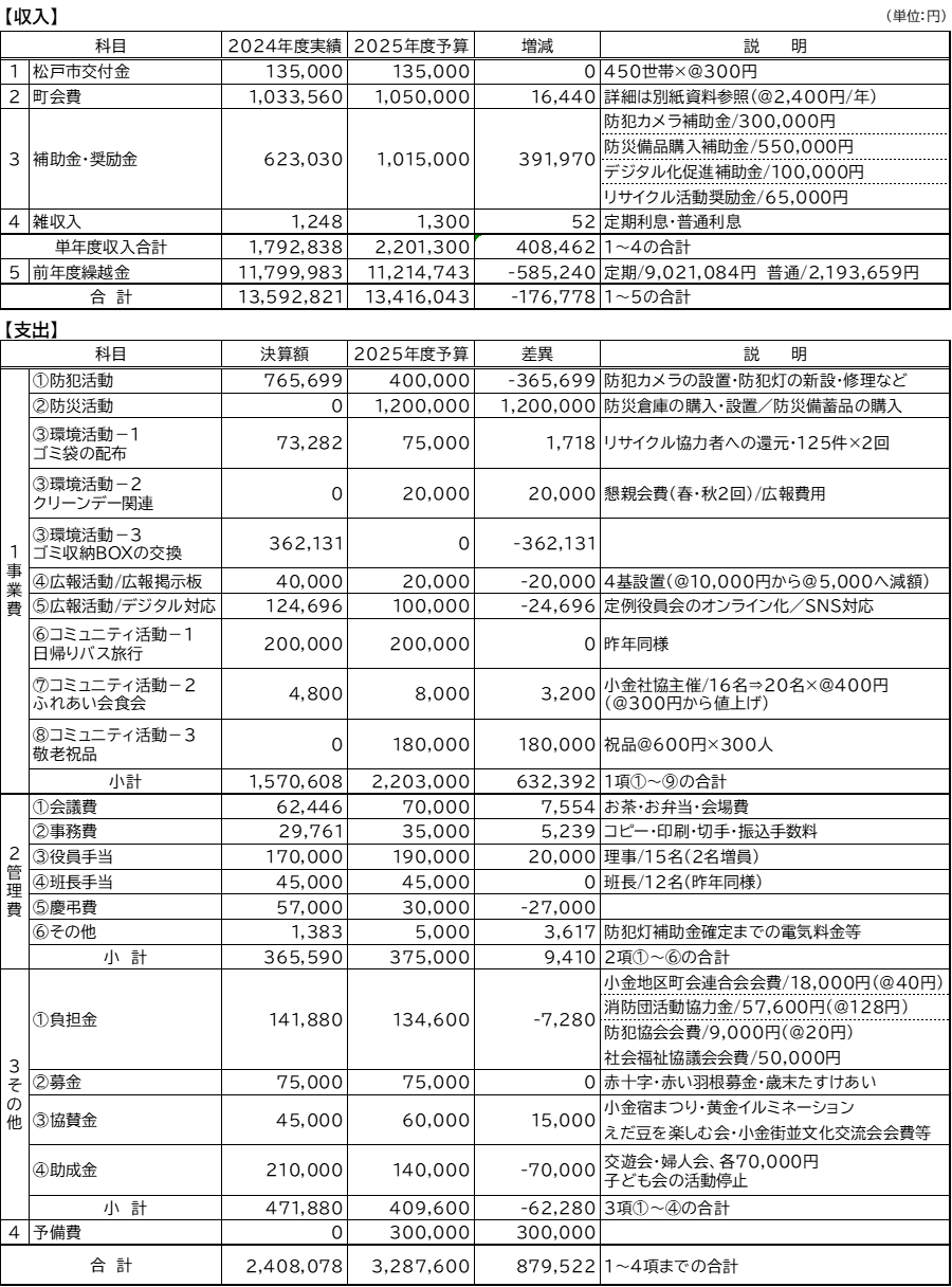 昨年度の主な支出は、防犯活動に約77万円、環境活動に約40万円、コミュニティ活動に約20万円となっている。
