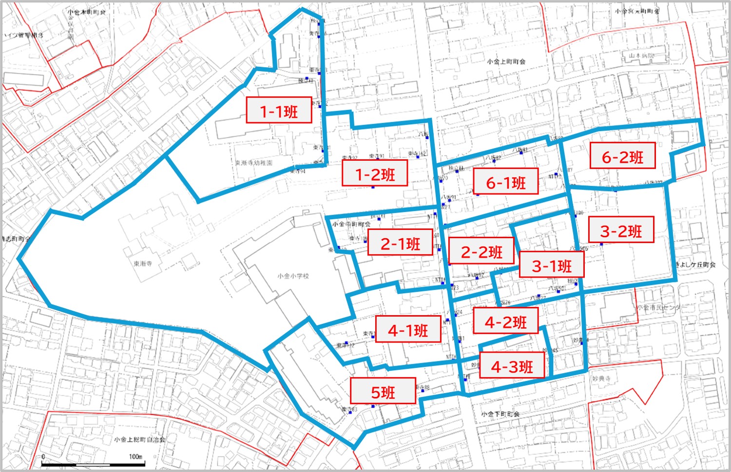 町会運営の重要な一役を担っているのが、班長体制です。小金中町町会は、6グループ、12の班でできています。各班には班長がおり、任期は1年で、各班内にお住いの方が持ち回りで班長に就いて頂いています。
