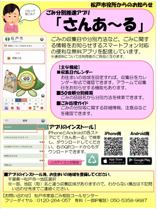 スマートフォンでごみの収集日や分別方法等をお知らせする便利な無料アプリを配信しています。